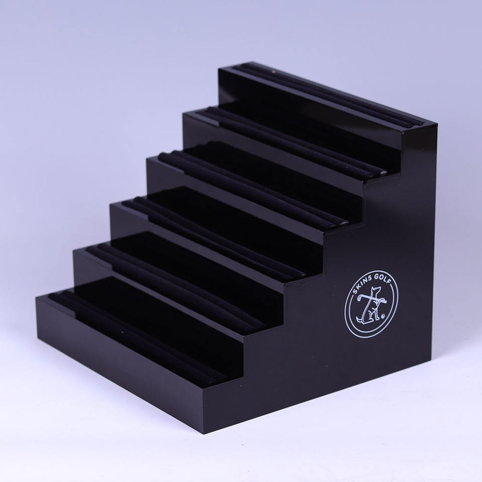 Présentoir de marque de golf à 5 niveaux en acrylique noir personnalisé avec insertion EVA Stand d'art moderne portable et personnalisé avec logo