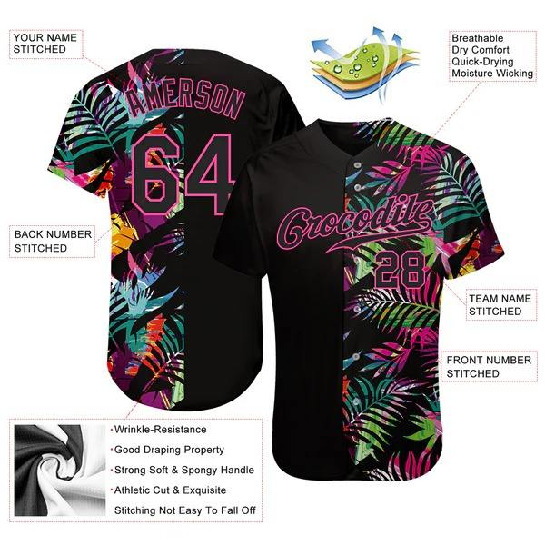 Maillot de football personnalisé noir et rose avec motif 3D feuilles de palmier tropicales – Tenue de sport authentique et respirante pour équipe