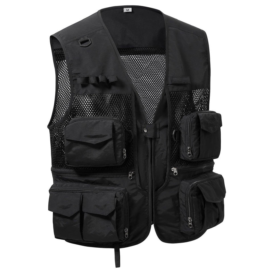 Gilet de pêche unisexe personnalisé noir, respirant, léger, en polyester avec fermeture éclair et col en V pour l'extérieur