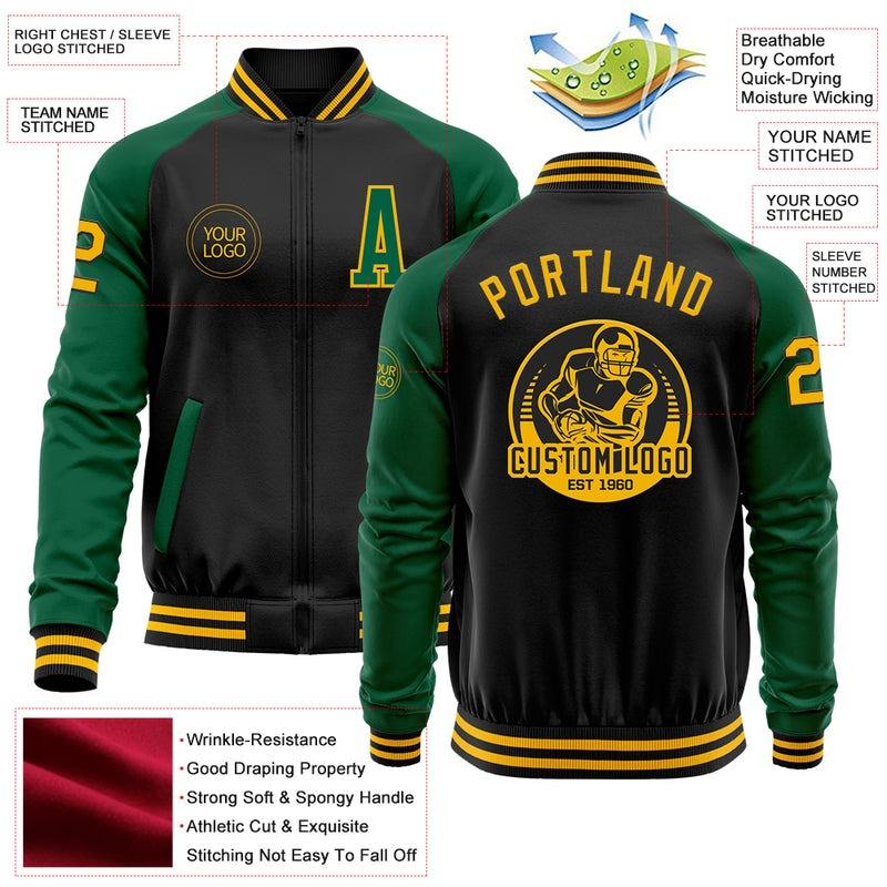 Blouson aviateur personnalisé noir doré-vert Kelly Varsity Letterman veste à glissière bicolore coupe-vent veste universitaire vintage pour homme