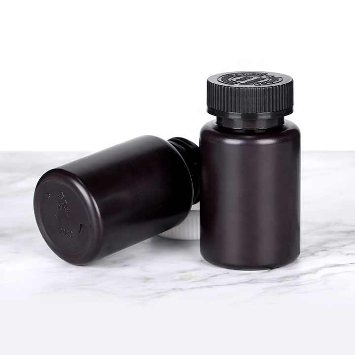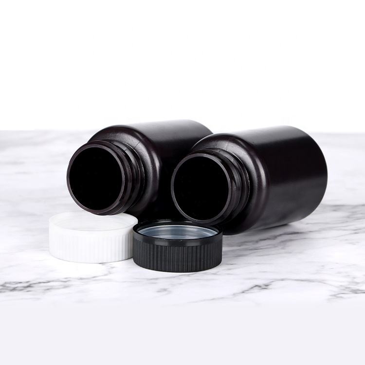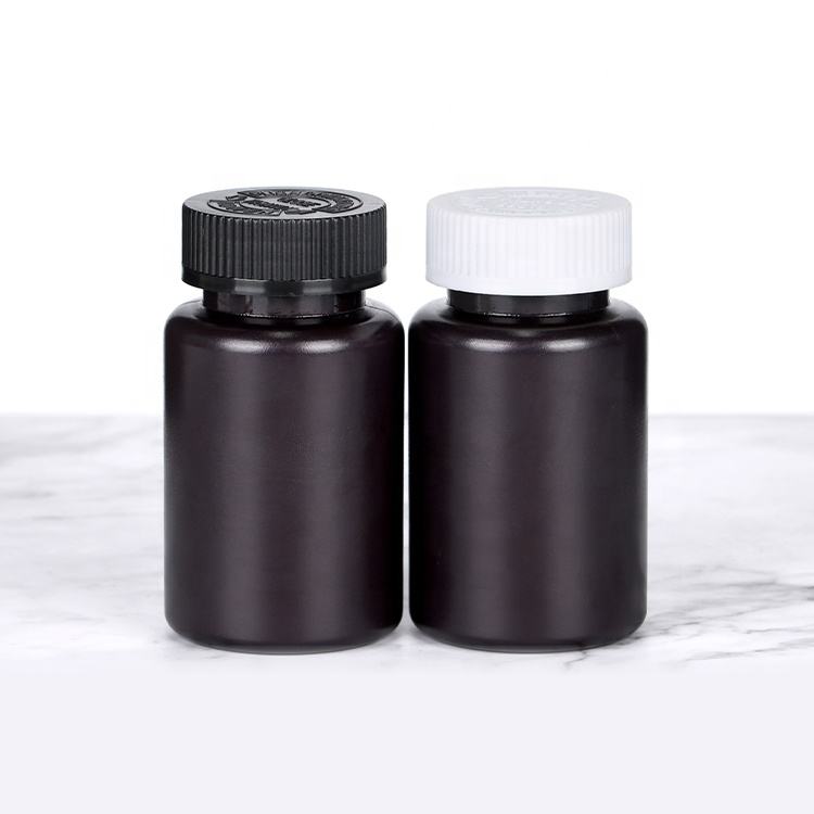 Custom Black HDPE Pill Bottle 100ml 120ml 150ml 200ml Vitamin Supplement Container Child Proof Metallic Cap Factory Wholesale