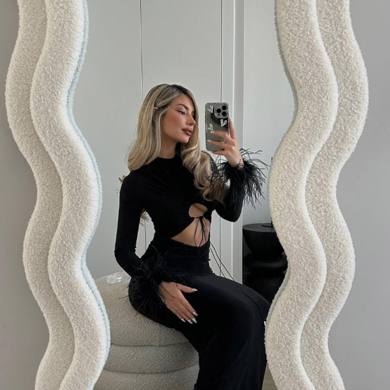 Ensemble de robe de soirée noir personnalisé, tendance, à épaules tombantes, avec découpes centrales et manches longues