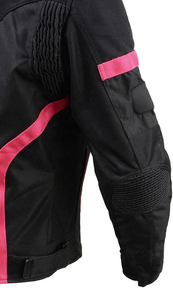 Blouson de moto respirant en maille/textile noir et rose personnalisé avec fermeture éclair et rembourrage en coton pour femme, OEM toutes saisons, numérique