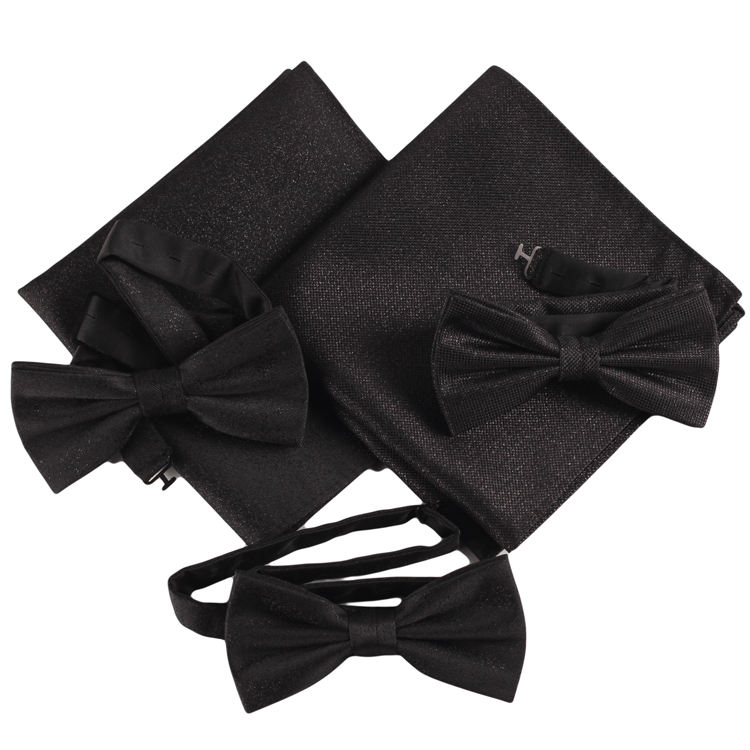 Ensemble personnalisé de couleur unie noire avec nœud papillon et mouchoir de poche de mariage en polyester métallisé pour hommes pour nœud papillon de fête Fo