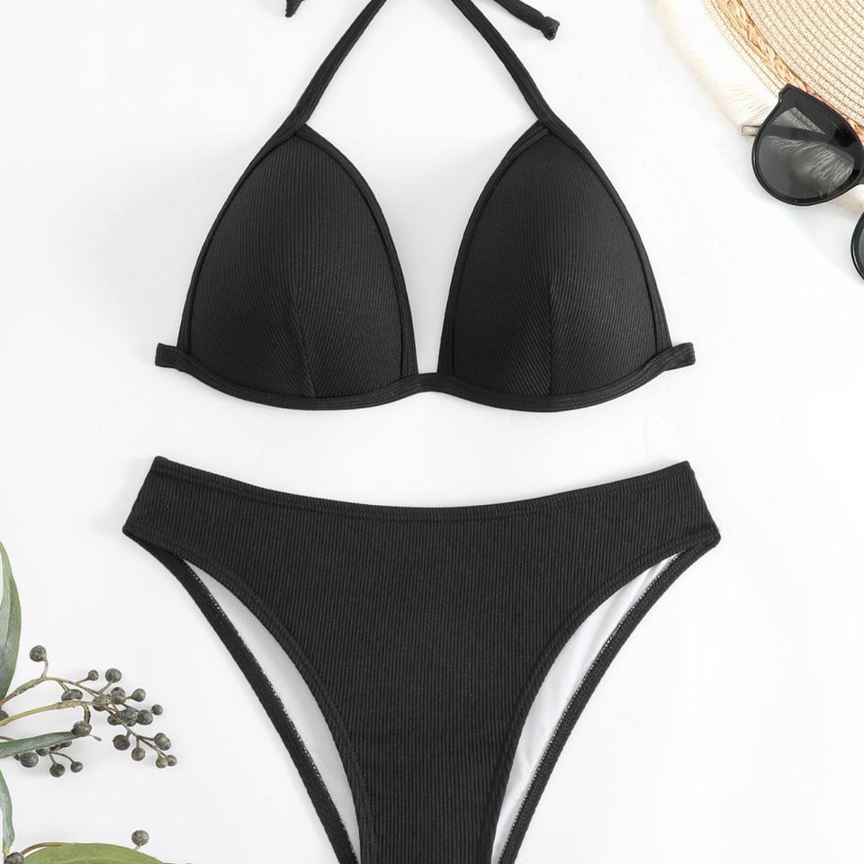 Ensemble bikini deux pièces noir personnalisé effet froissé, motif uni, séchage rapide, écologique, maillot de bain et tenue de plage tendance pour femme