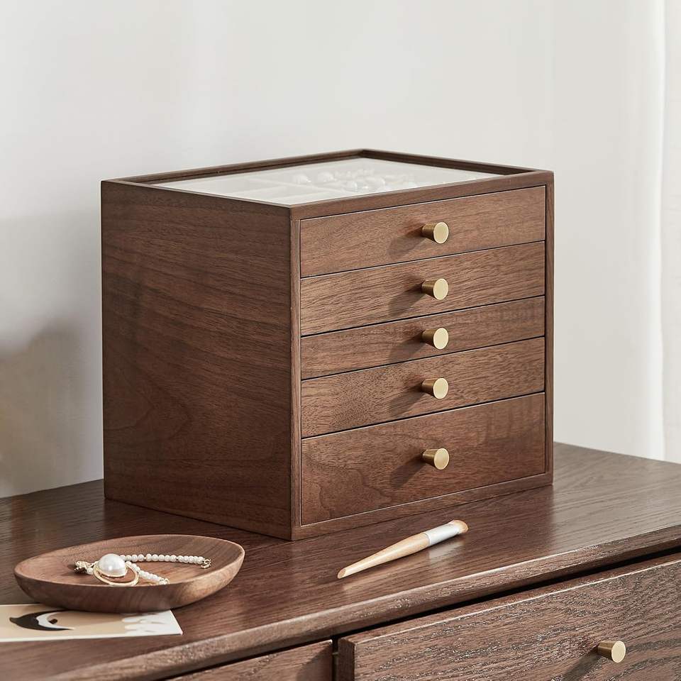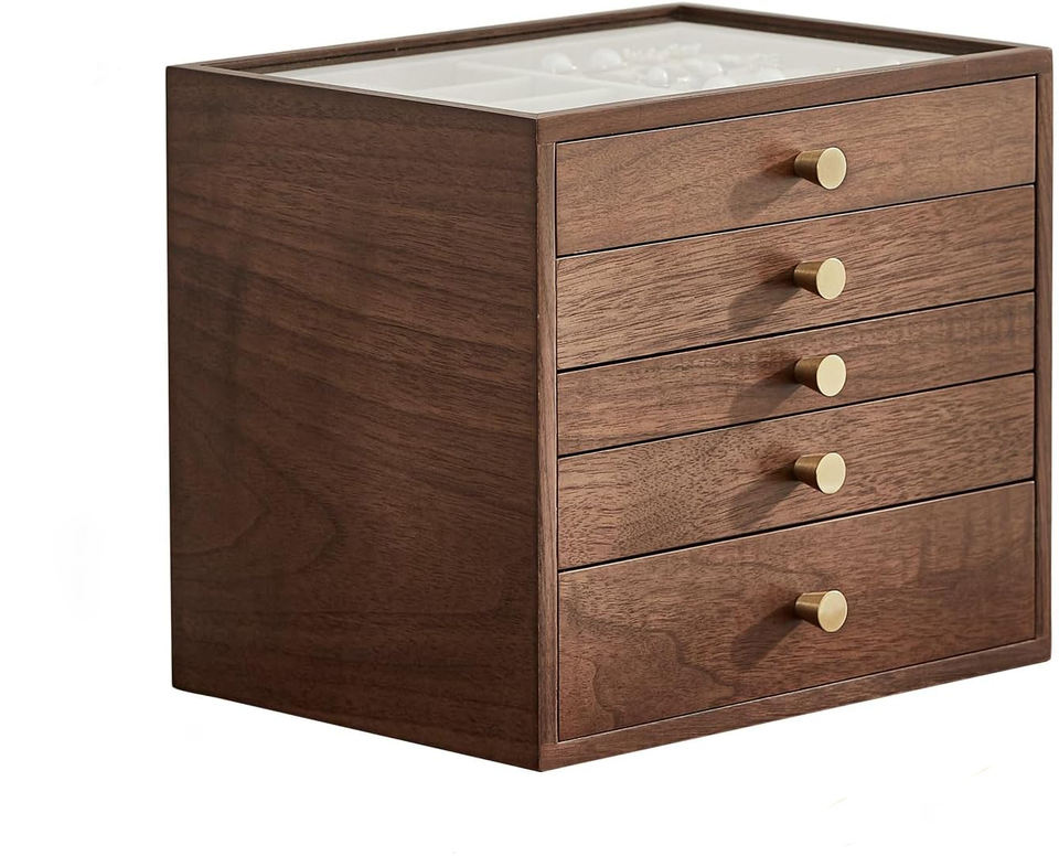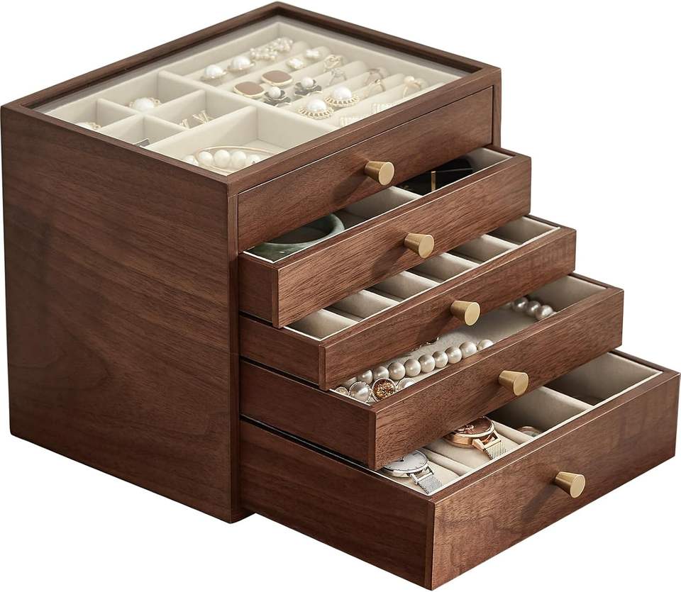 Boîte à bijoux en bois de noyer noir personnalisée, grande boîte organisatrice à tiroirs pour femmes avec couvercle en verre pour colliers, montres, bagues, boucles d'oreilles
