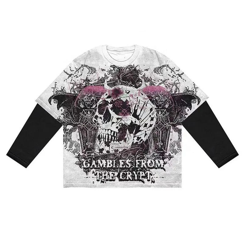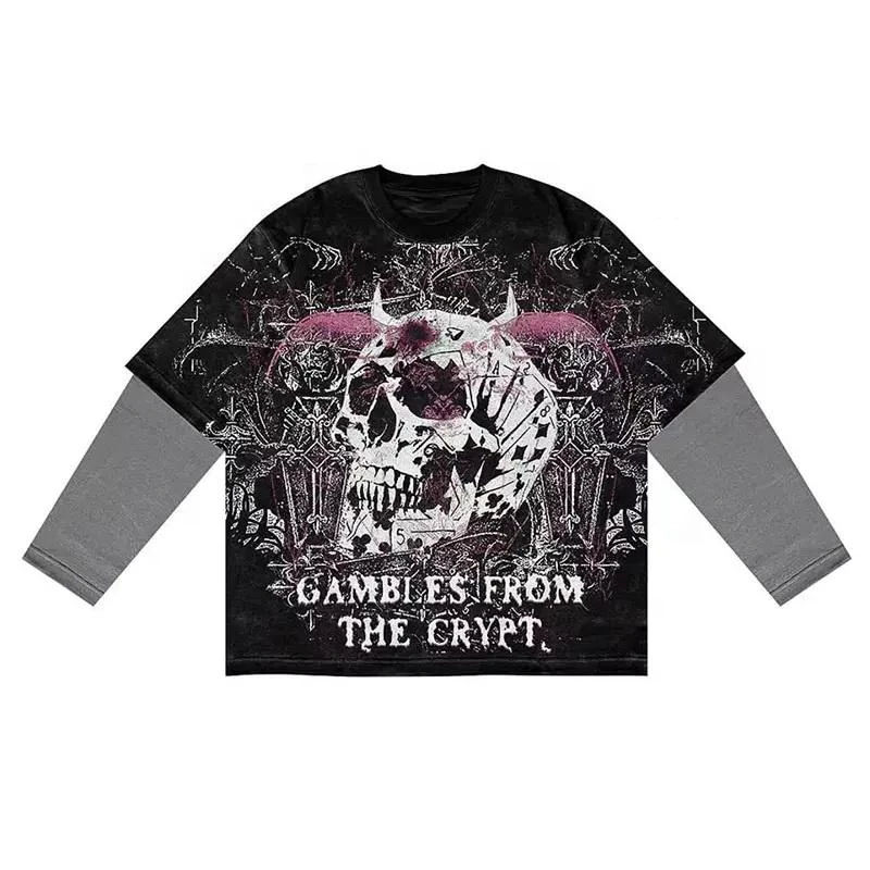 T-shirt décontracté personnalisé à manches longues pour homme, en coton épais double couche, délavé au soleil et à l'acide, avec poche