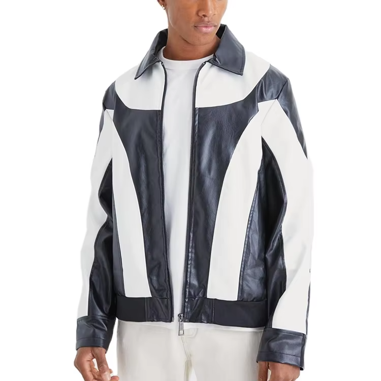 Veste en similicuir PU bleu personnalisée pour homme, style moto, coupe carrée, avec fermeture éclair et blocs de couleur, collection automne