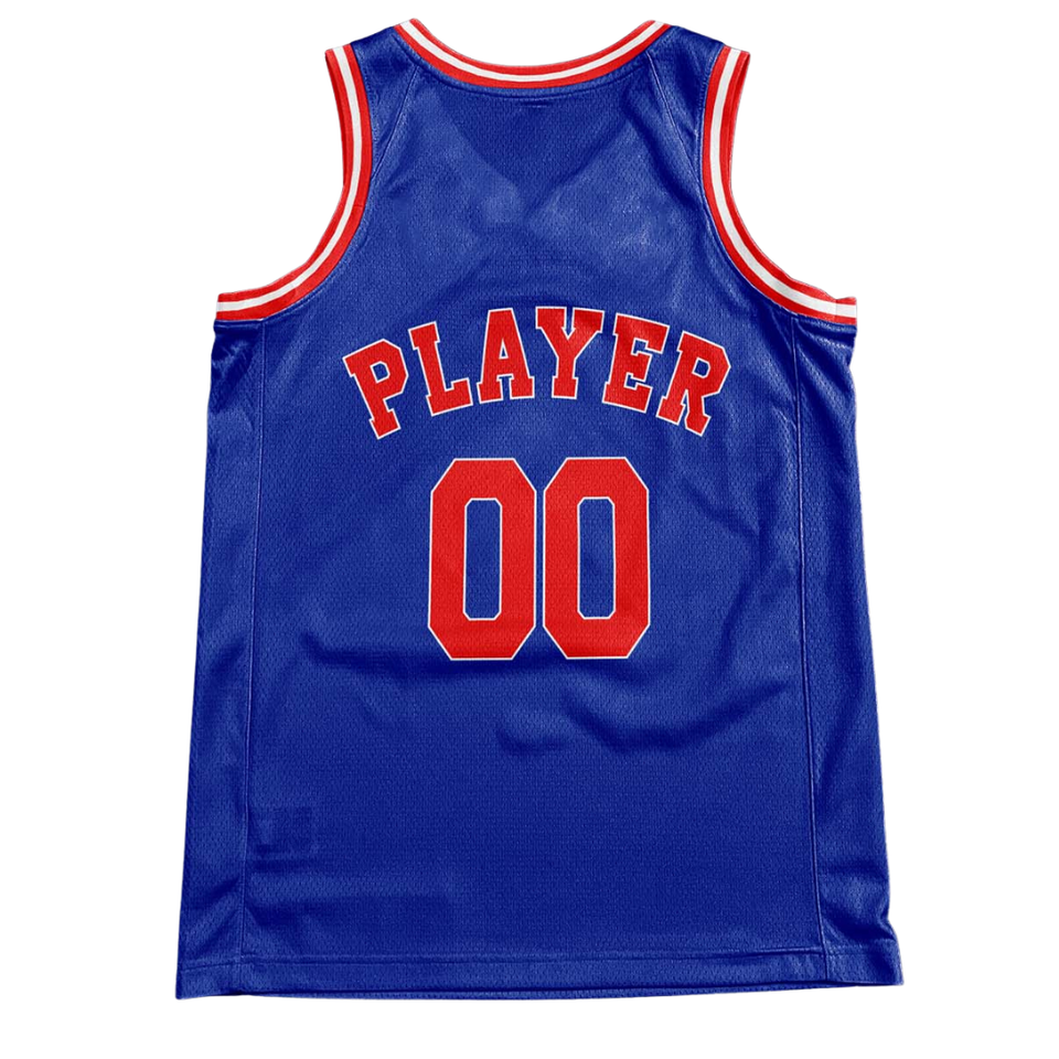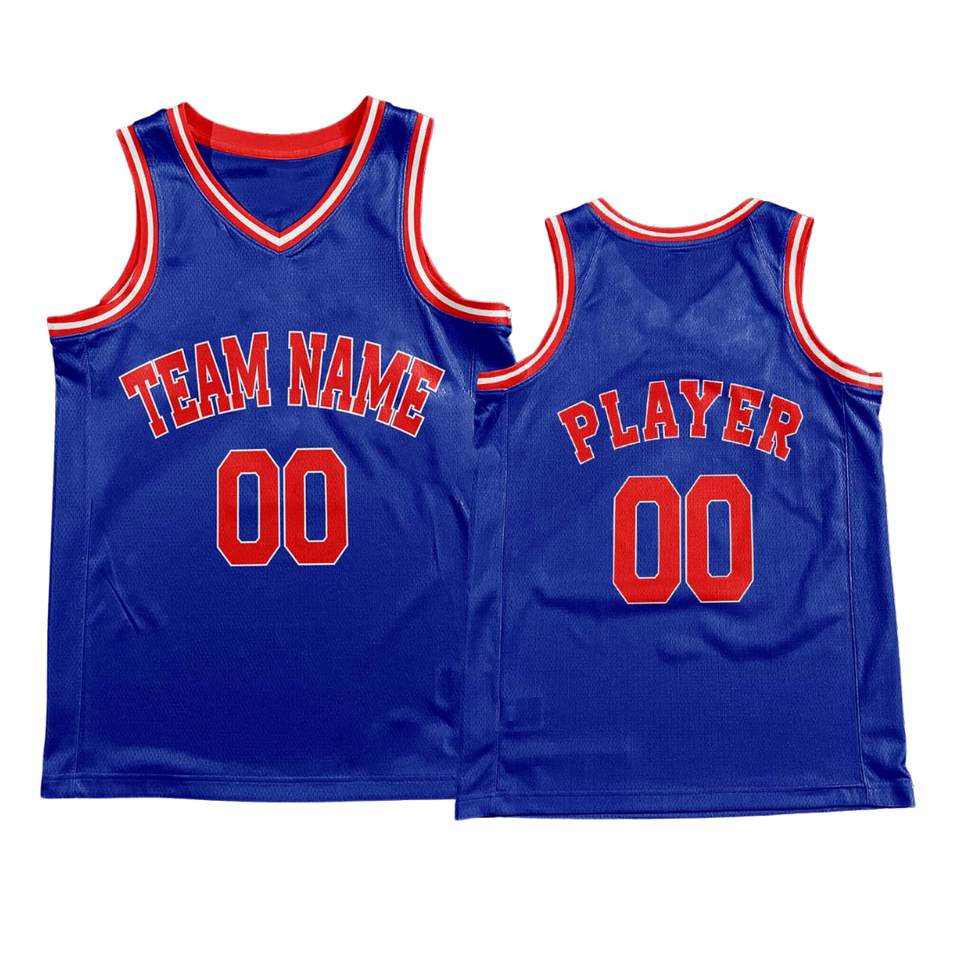 Ensemble uniforme de basket-ball bleu personnalisé, maillot et short rétro avec texte rouge, nom et numéro de l'équipe, design classique