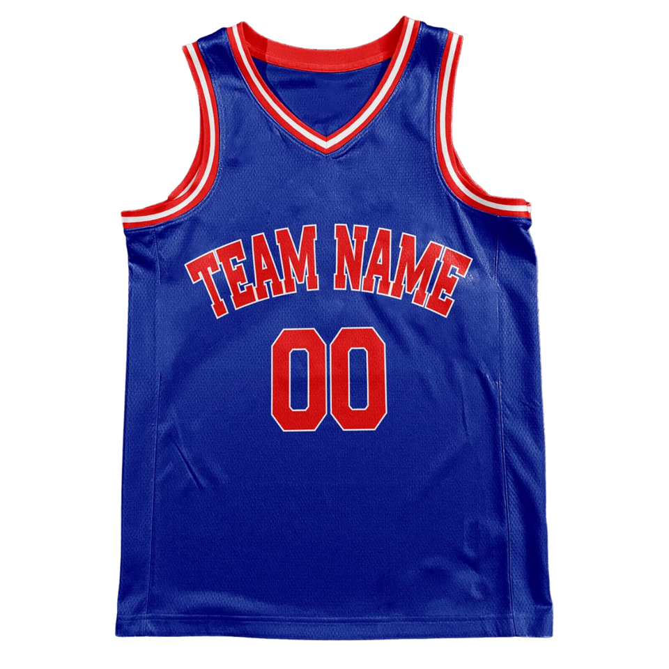 Ensemble uniforme de basket-ball bleu personnalisé, maillot et short rétro avec texte rouge, nom et numéro de l'équipe, design classique