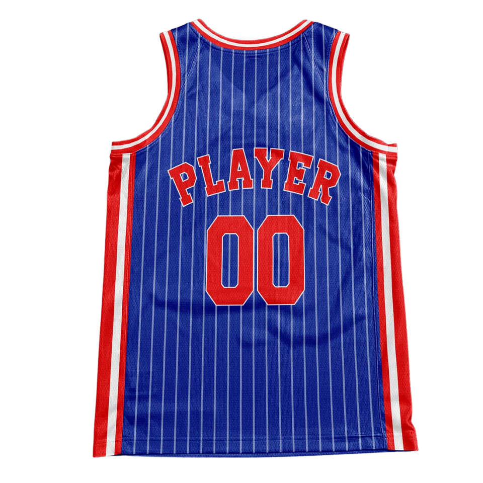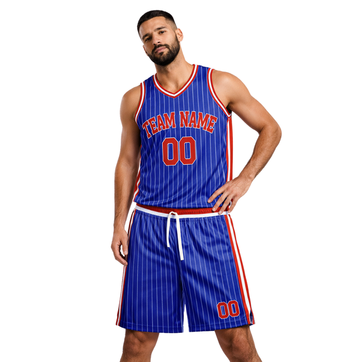 Ensemble uniforme de basket rétro personnalisé à rayures bleues, maillot et short avec bordure de texte rouge et blanc, design rétro avec nom et numéro de l'équipe