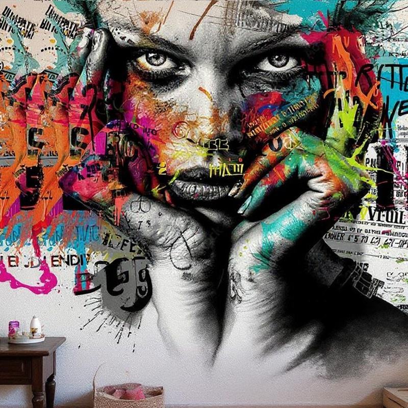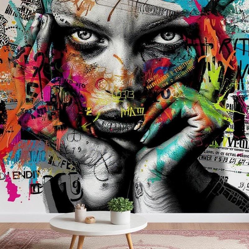 Éclaboussures de peinture lumineuses et colorées personnalisées sur la décoration murale de papier peint de graffiti de visage de femme