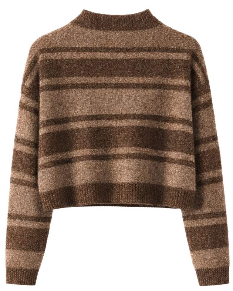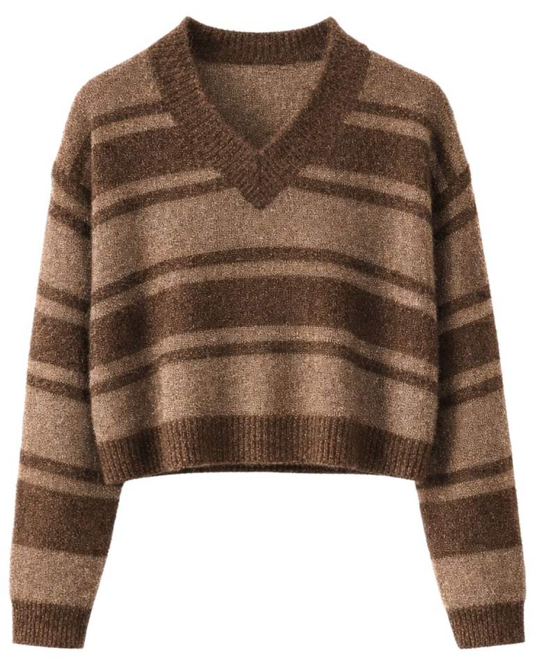 Pull en maille douce à col en V rayé marron personnalisé pour femmes, manches longues, décontracté, tendance, pour la vente en gros