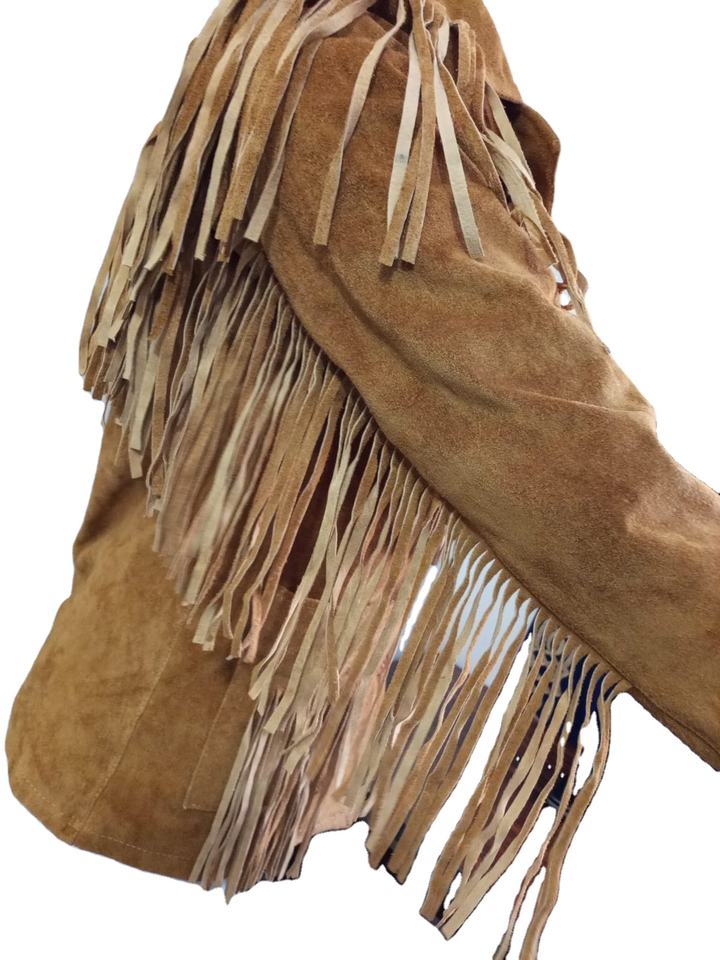 Veste en daim marron personnalisée pour homme, respirante, coupe-vent, fermeture à boutons-pression, col pointu, franges décoratives, style western cowboy