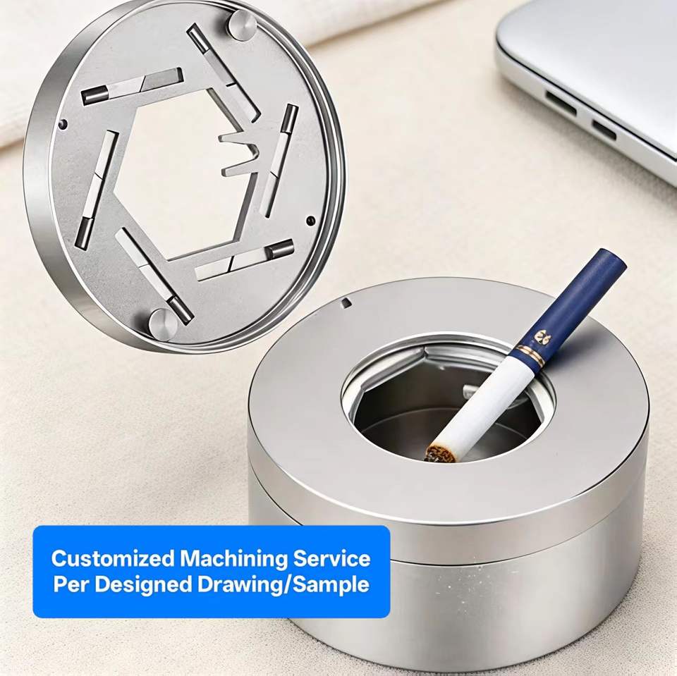 Cendrier en métal sur mesure usiné CNC, finition mate, PVD brillant, usinage par électroérosion à fil, titane, laiton, acier inoxydable, aluminium, avec couvercle