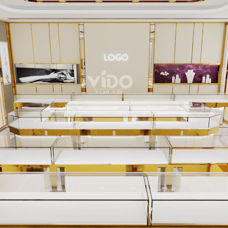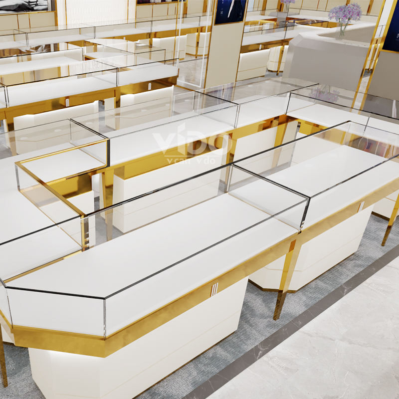 Vitrine en verre or champagne personnalisée Présentoir de luxe avec couleur personnalisée et taille personnalisée pour comptoir de bijouterie