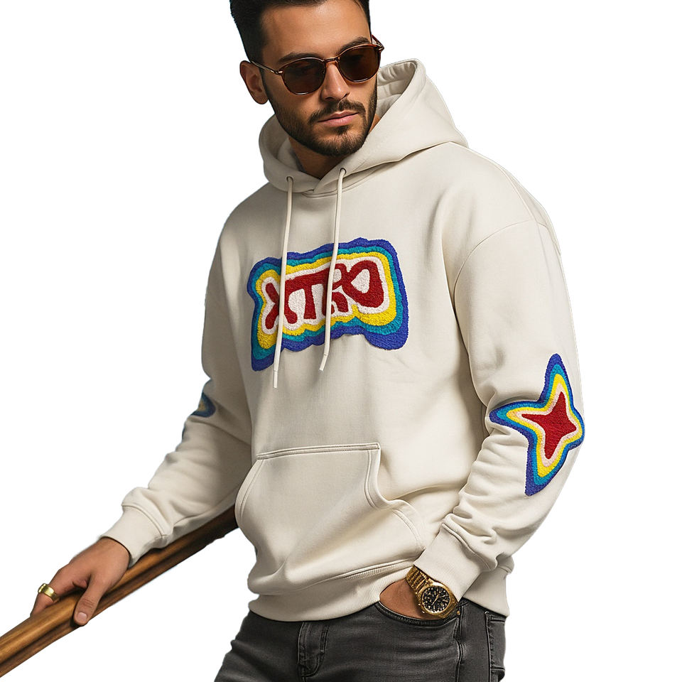 Sweat à capuche surdimensionné en molleton de coton pour homme avec patchs brodés en chenille personnalisés, style décontracté streetwear