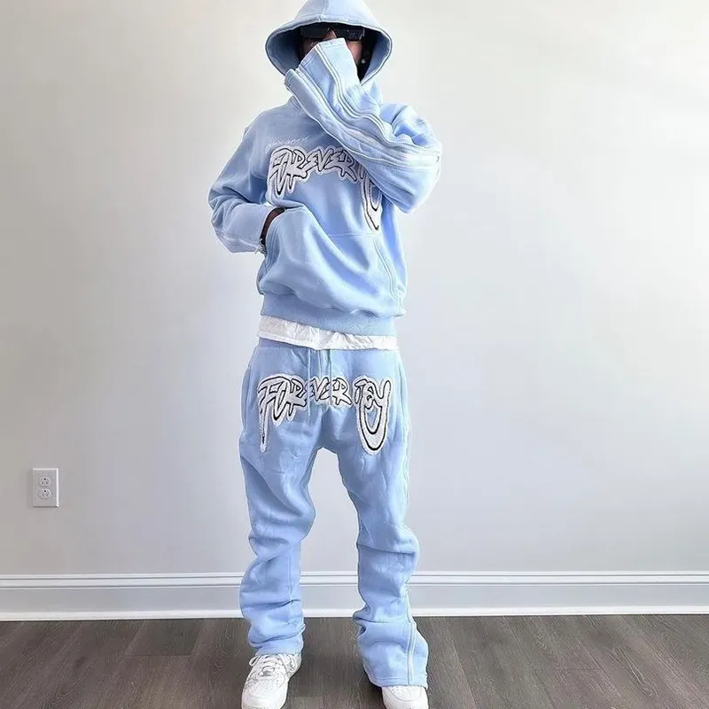 Survêtement brodé chenille personnalisé survêtement superposé à fermeture éclair à manches coutures latérales pantalon de survêtement évasé pour hommes ensembles de deux pièces