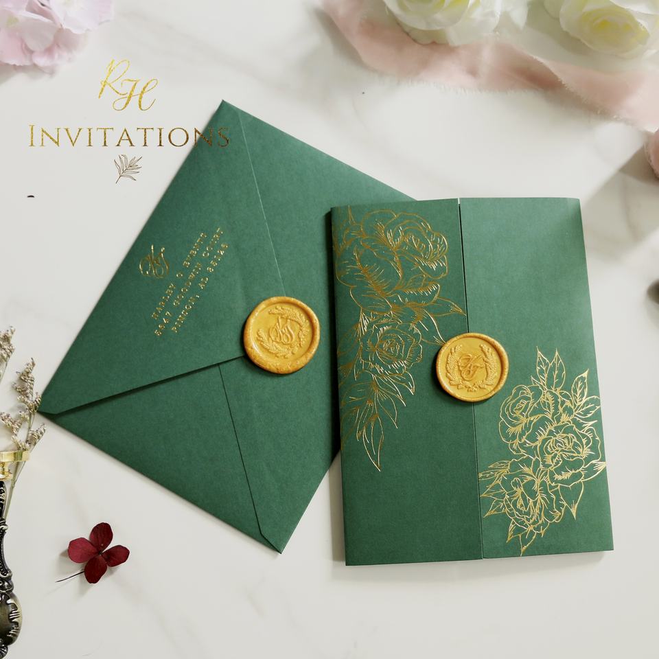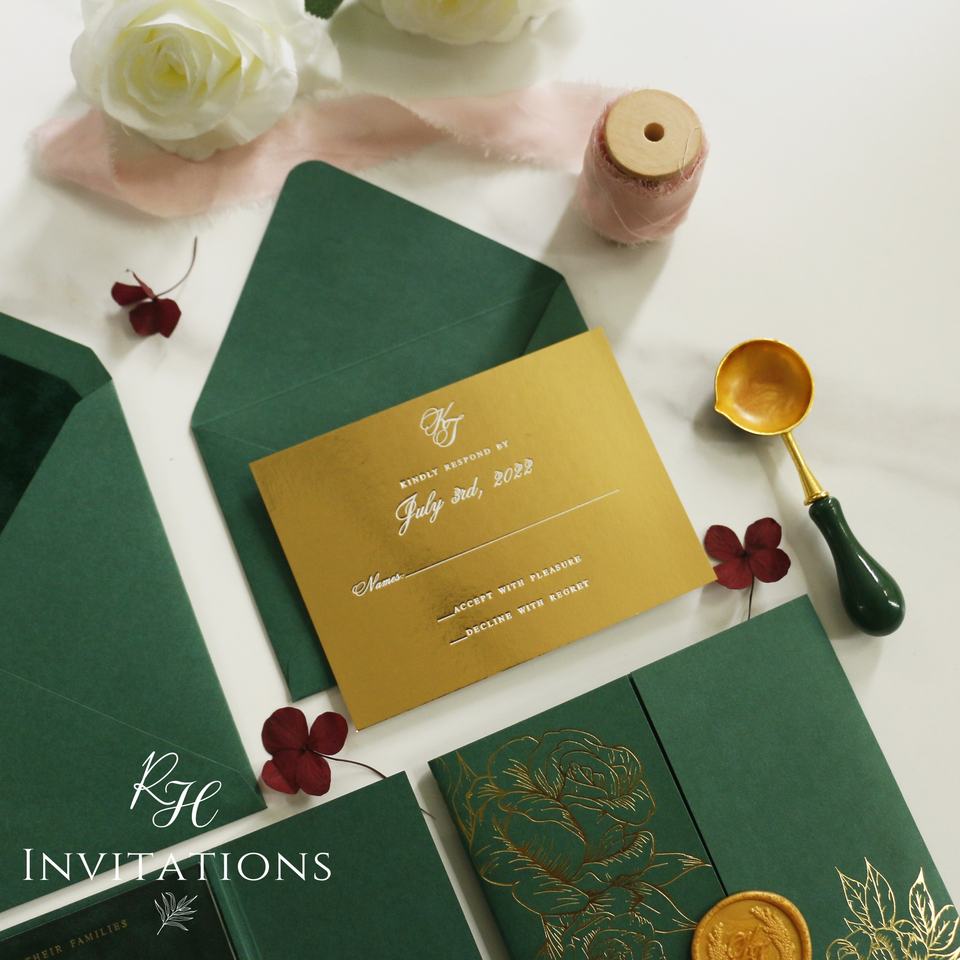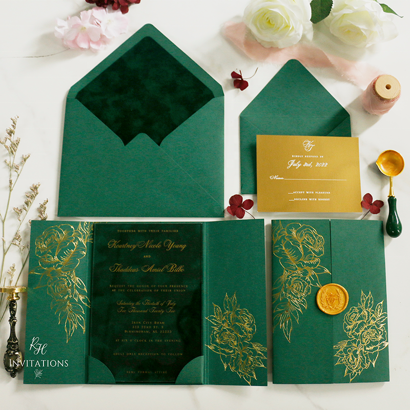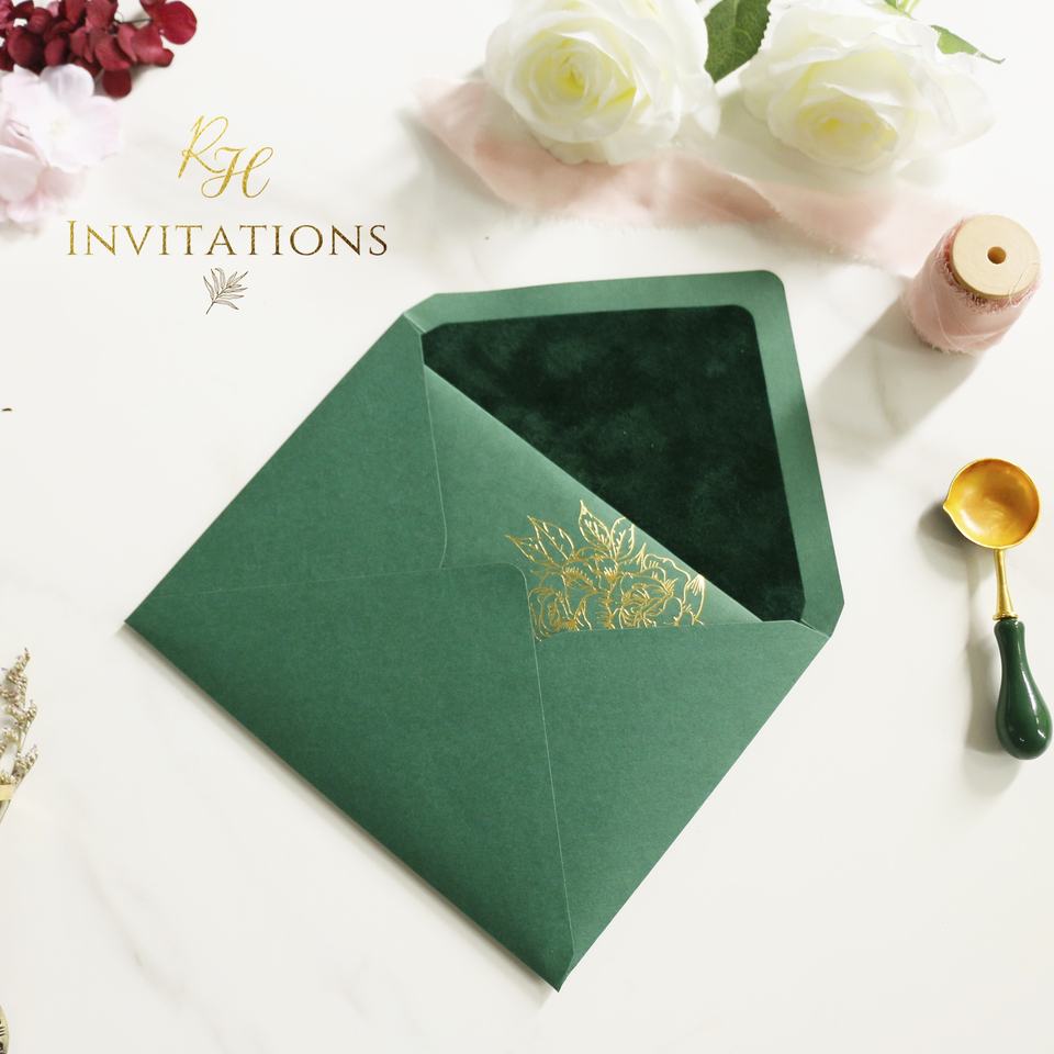 Carte de mariage en velours vert émeraude et enveloppe de doublure en velours vert foncé