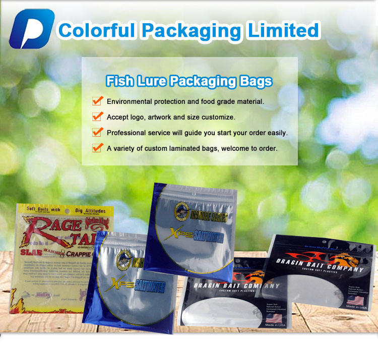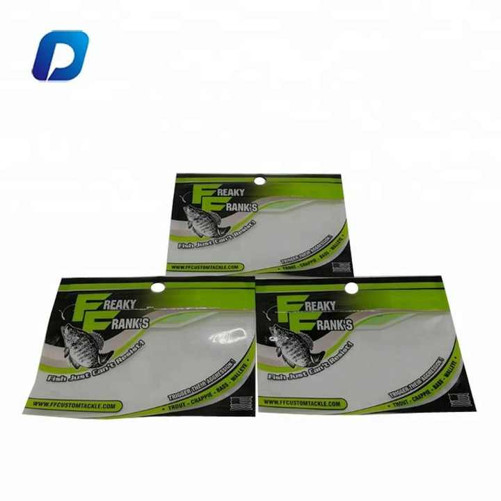 Emballage en plastique souple personnalisé avec fenêtre transparente en PET et nylon composite, fermeture éclair, durable, pour appâts de pêche, leurres de pêche, sac en mylar