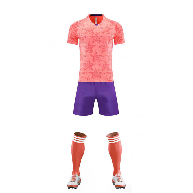 Ensemble d'uniformes de football personnalisés avec logo d'équipe, service OEM, 100% polyester, séchage rapide, respirant, col rond, blanc et violet, été