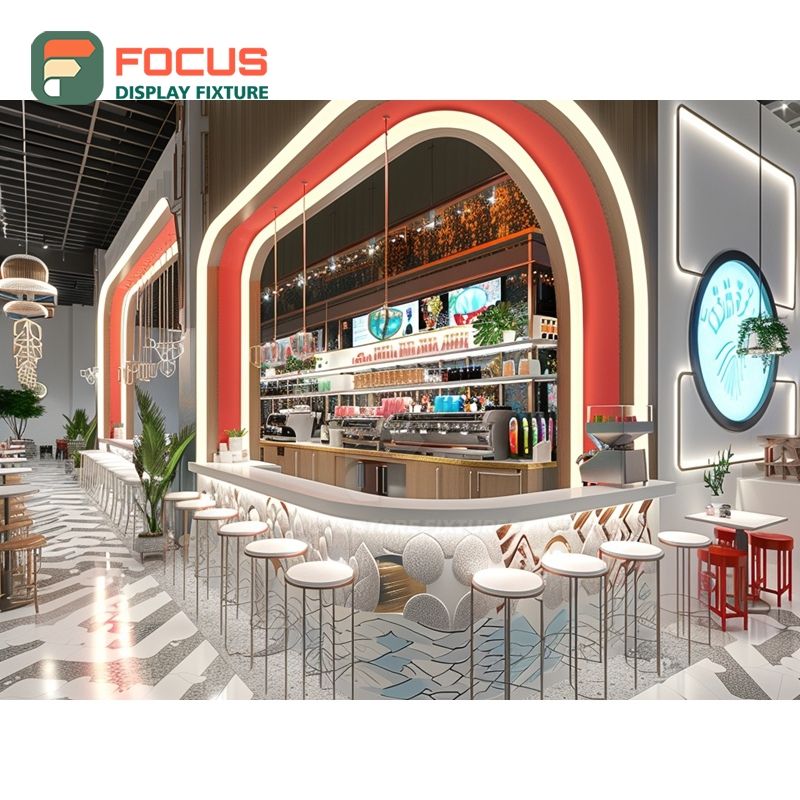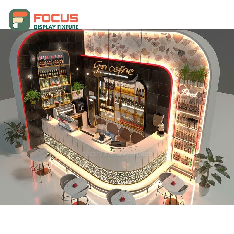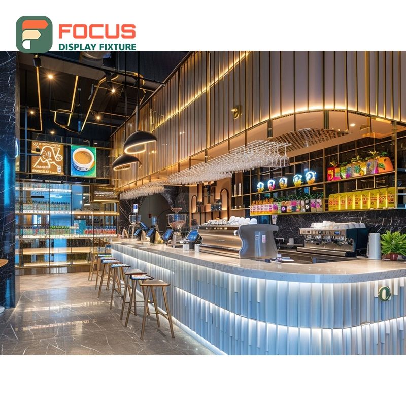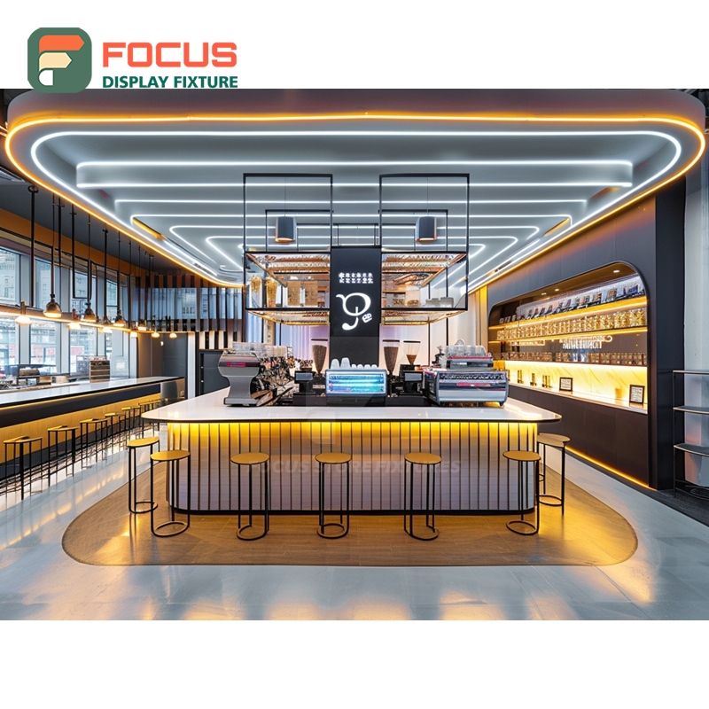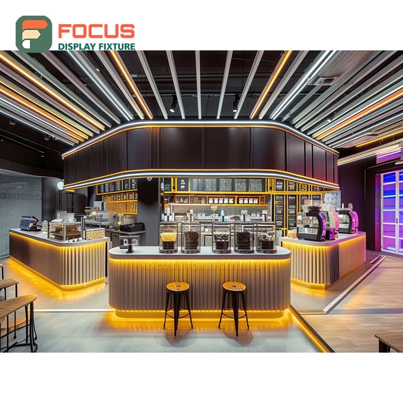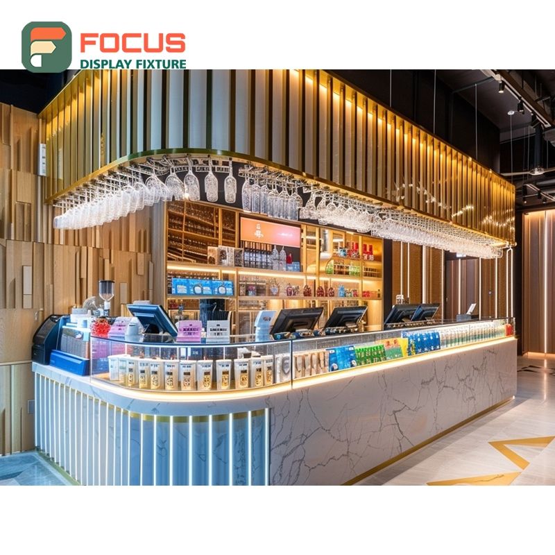 Comptoir de service à café personnalisé, vitrine de boulangerie, comptoir d'accueil commercial en bois grainé pour café