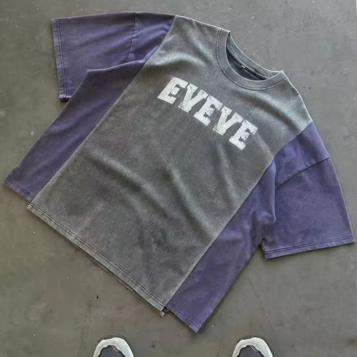 T-shirt personnalisé en pur coton à col rond et imprimé vintage délavé avec blocs de couleurs