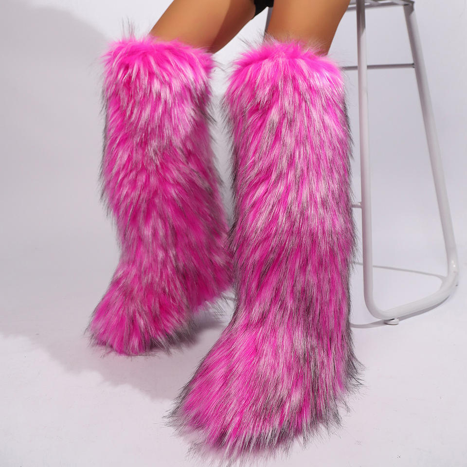 Bottes pour femmes au genou en fausse fourrure de couleur personnalisée, bottes d'hiver plates et chaudes en peluche