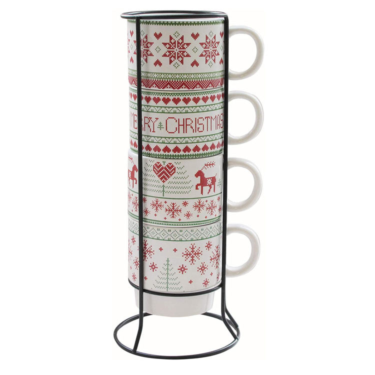 Ensemble de tasses à thé au lait en porcelaine couleur personnalisée, 4 tasses à café en céramique empilables avec motif pingouin de Noël, support métallique thermique