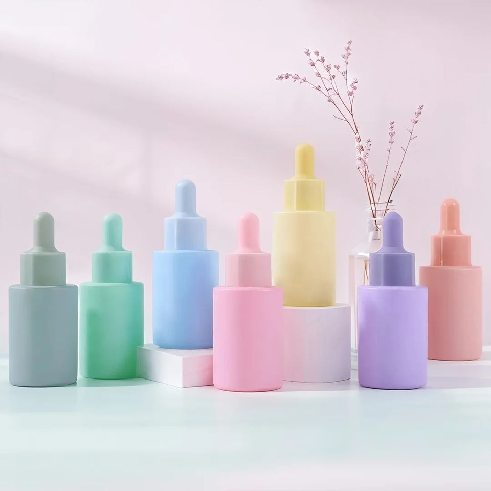 Flacon compte-gouttes en verre d'huile essentielle vide mat de 30ml de couleur personnalisée pour les soins de la peau des cheveux Surface de sérigraphie en forme de cylindre