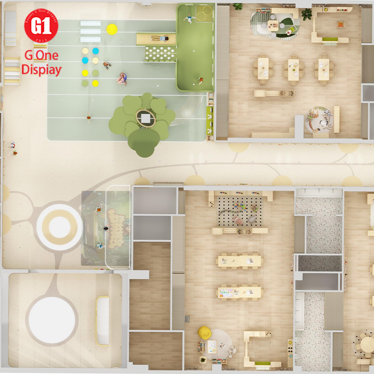 Aménagement intérieur personnalisé pour restaurant parent-enfant et aire de jeux pour enfants, avec décoration sur mesure.
