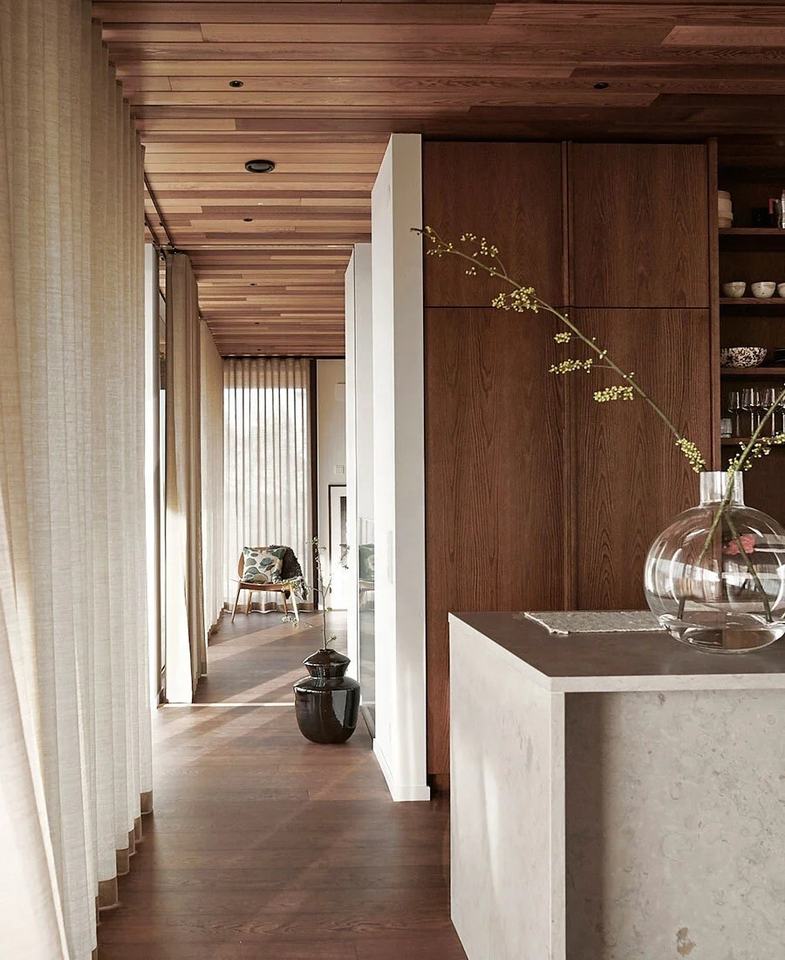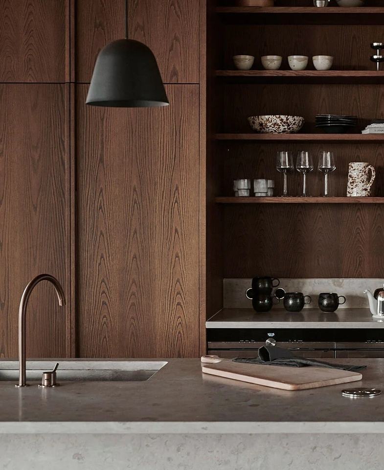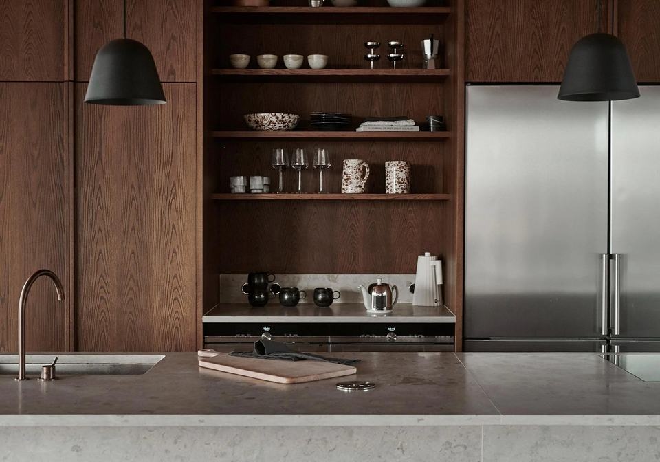 Cuisine îlot en béton sur mesure, rangement ouvert, appareils électroménagers encastrés, finition mate, portes cachées