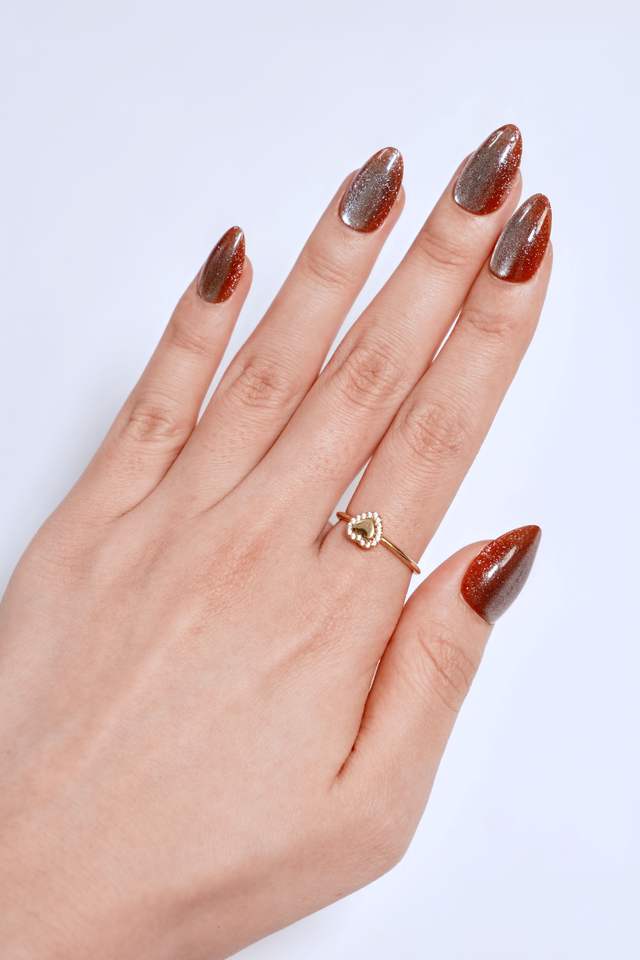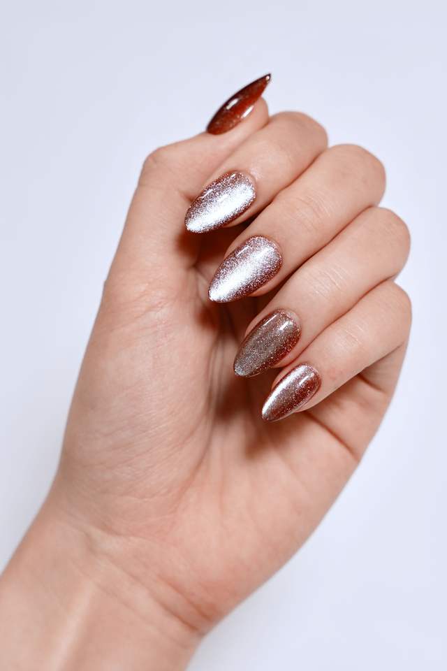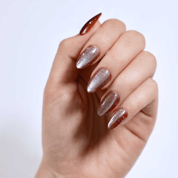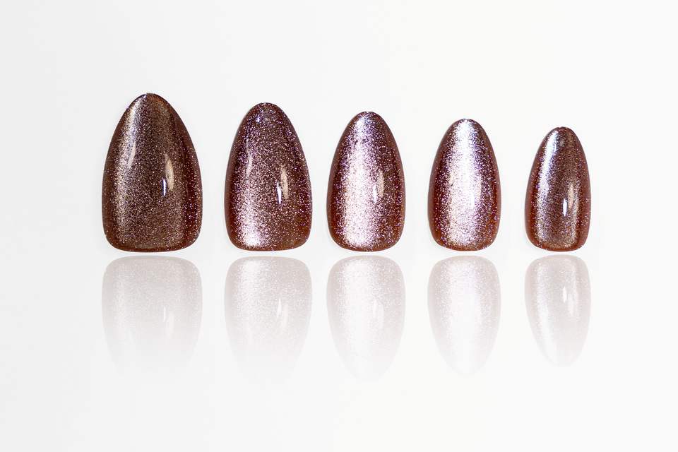 Faux ongles artificiels en forme d'amande, personnalisés, avec paillettes de cuivre, effet métallique, vente en gros, fabrication OEM ODM, ongles à presser