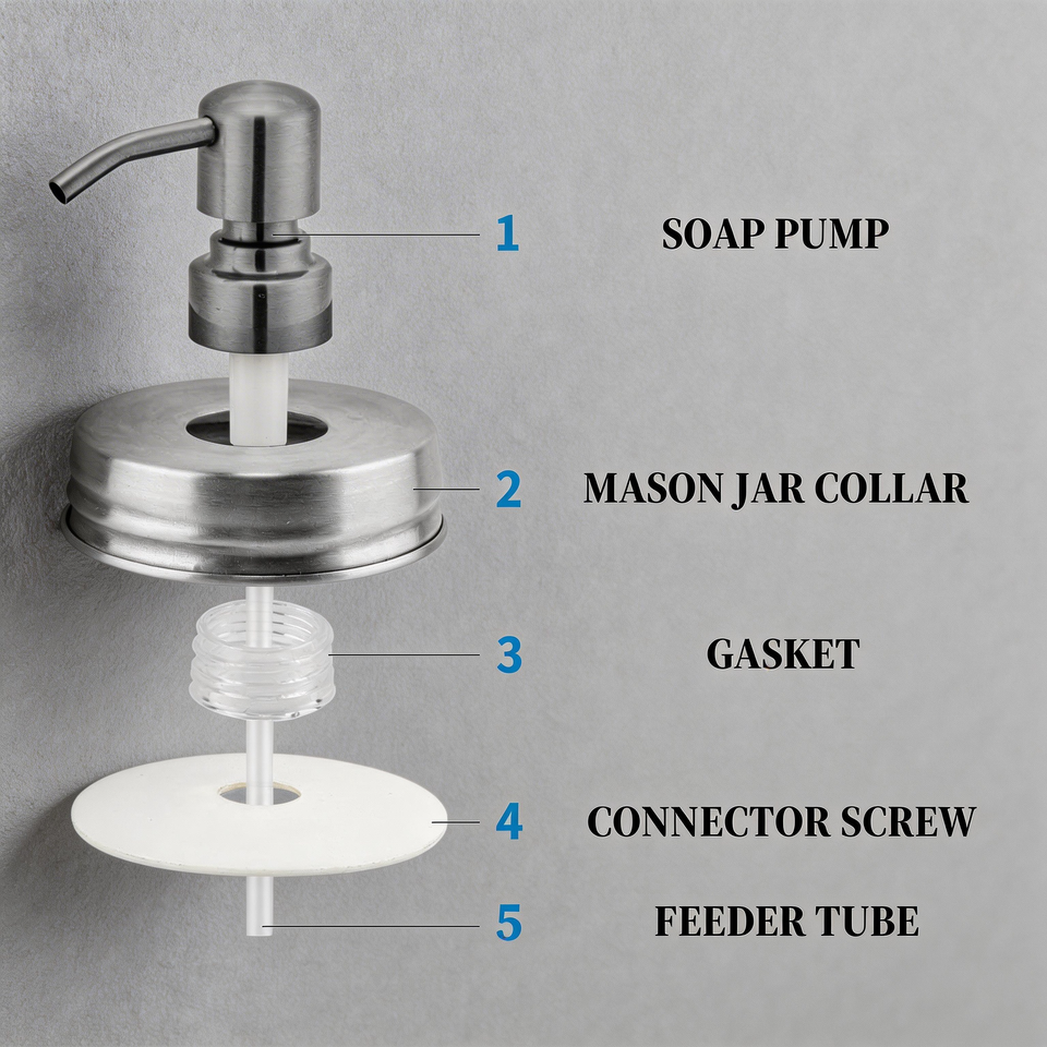 Nom du produit:Couvercle de distributeur de savon pour bocal Mason, couvercle de pompe de distributeur de lotion en acier inoxydable