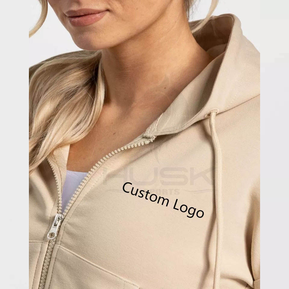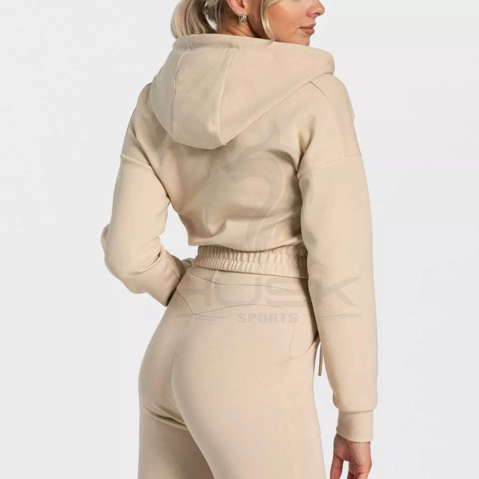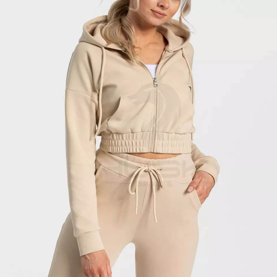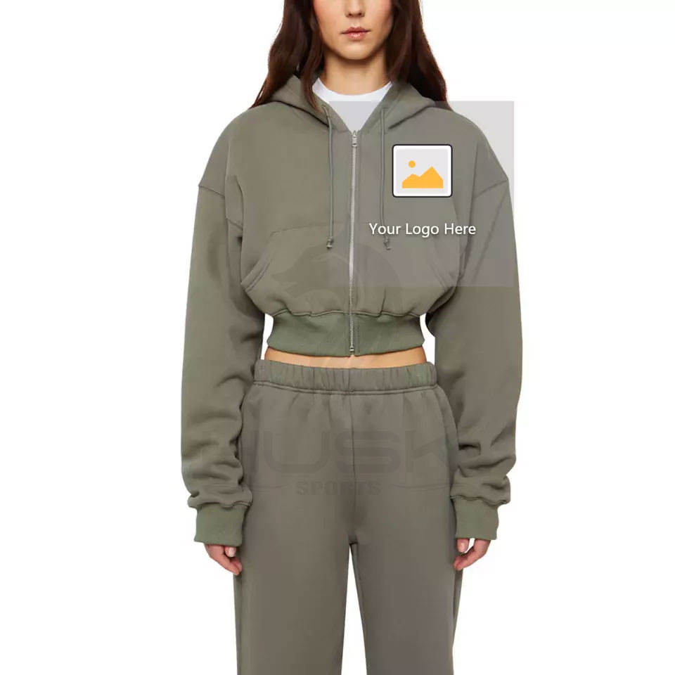 Sweat-shirt en coton de haute qualité pour femmes lourd uni à manches longues à capuche zippée sur le devant Crop Top Design brodé polaire pour l'hiver