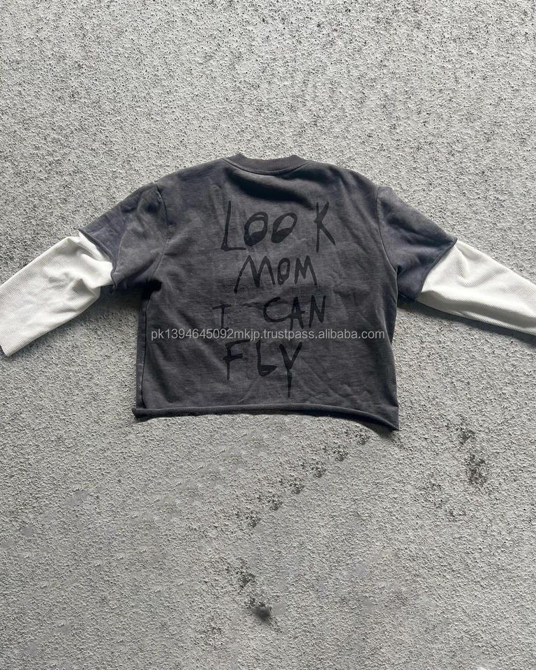 T-shirt personnalisé en coton brut avec ourlet Boxy Stone Acid Wash brodé Distressed T-shirt Patch double couche à manches longues T-shirts pour hommes