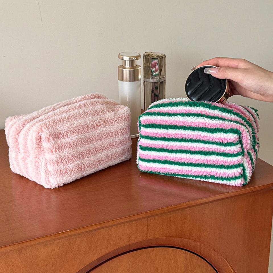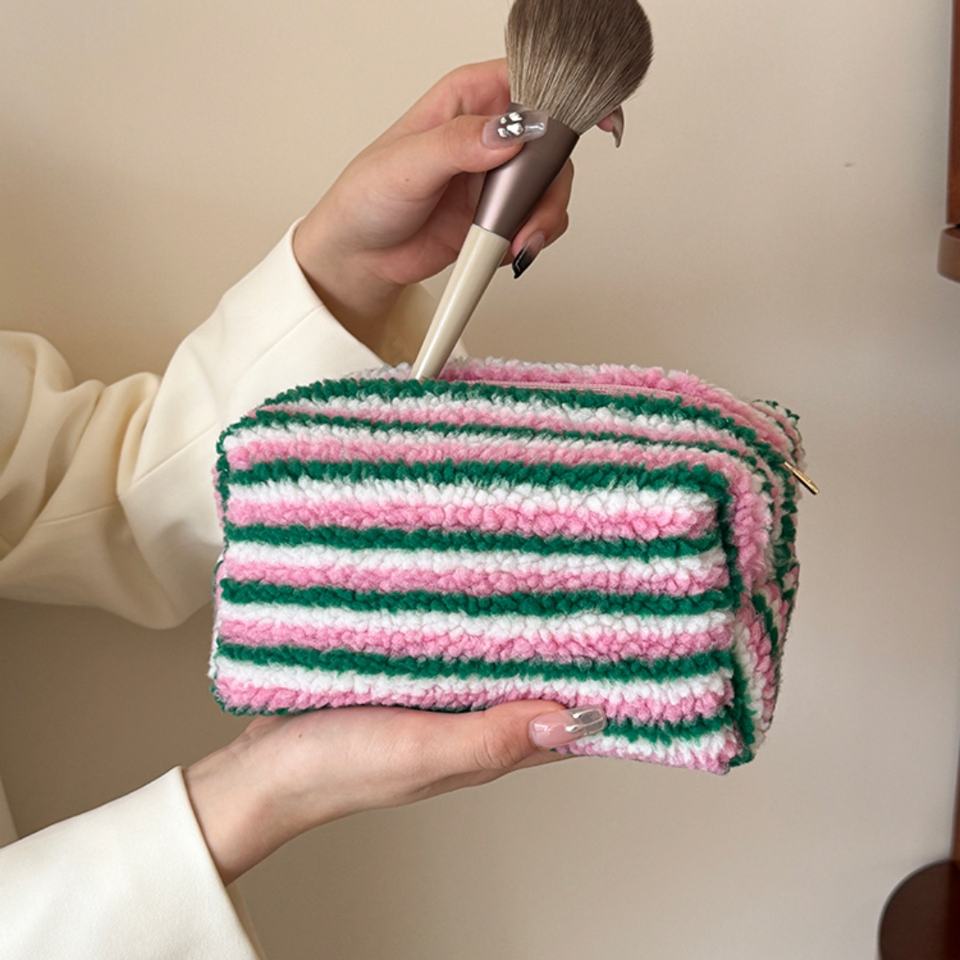 Sac de maquillage rayé en laine d'agneau coton personnalisé fermeture éclair étiquette de lavage doux pour l'hiver sac cosmétique 8 pouces usine vente en gros