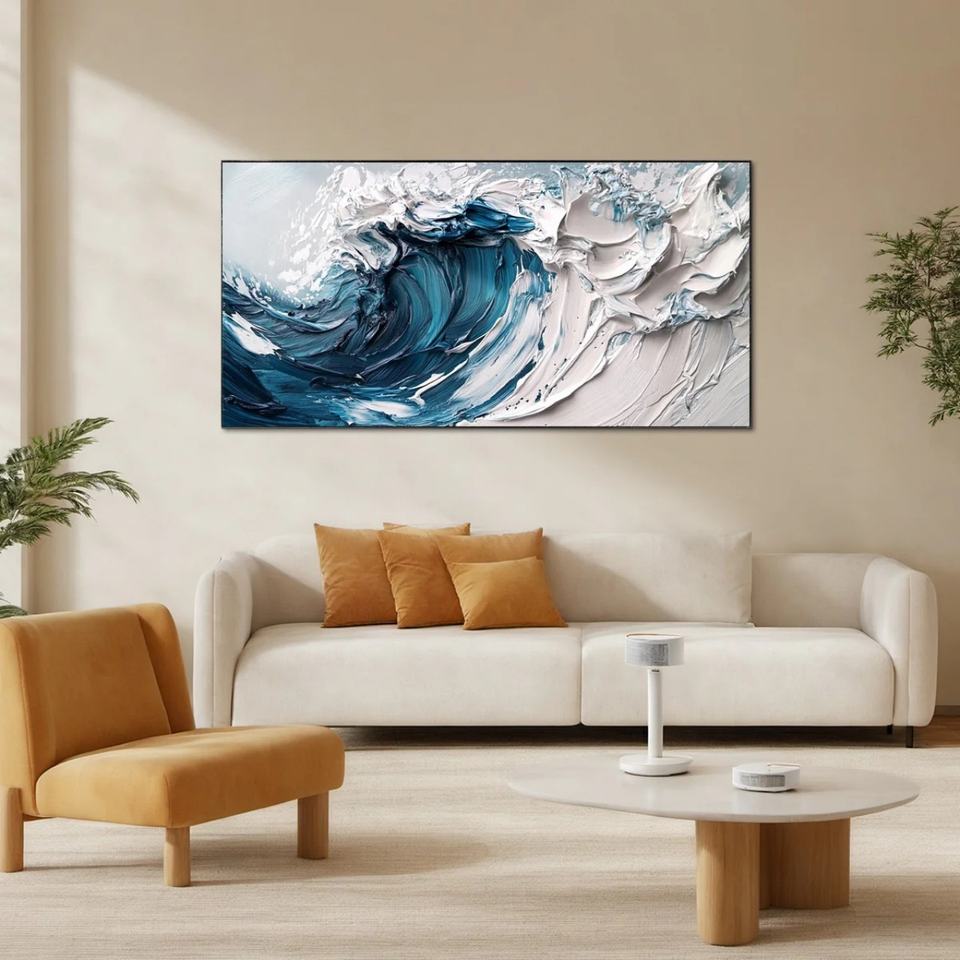 Peinture à l'huile originale personnalisée « Vague éclatante » avec texture impasto, motif vague océanique bleue et blanche, art mural océanique, œuvre d'art moderne peinte à la main