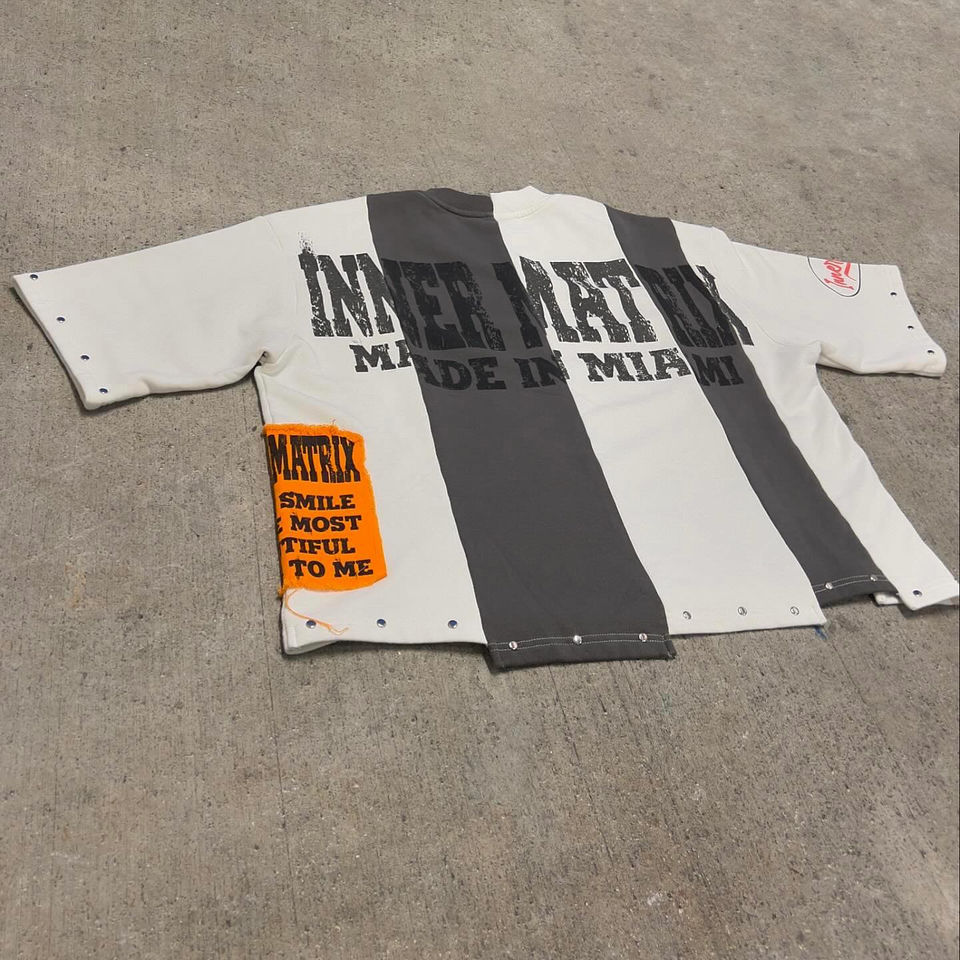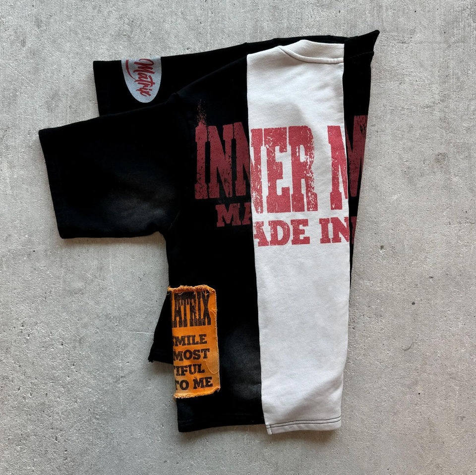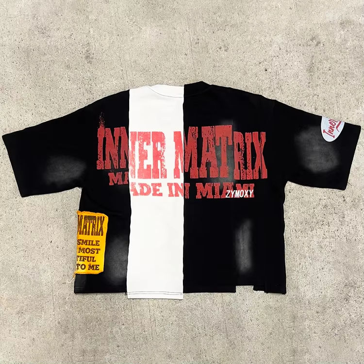 T-shirt homme streetwear personnalisé, sérigraphié, à panneaux, coupe carrée, color block, effet soleil délavé, patchwork, ourlet asymétrique coupé-cousu