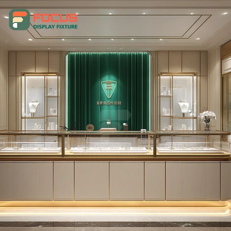 Fabricant d'agencements de magasins de bijoux sur mesure, finition stratifiée, vitrine de présentation de marque