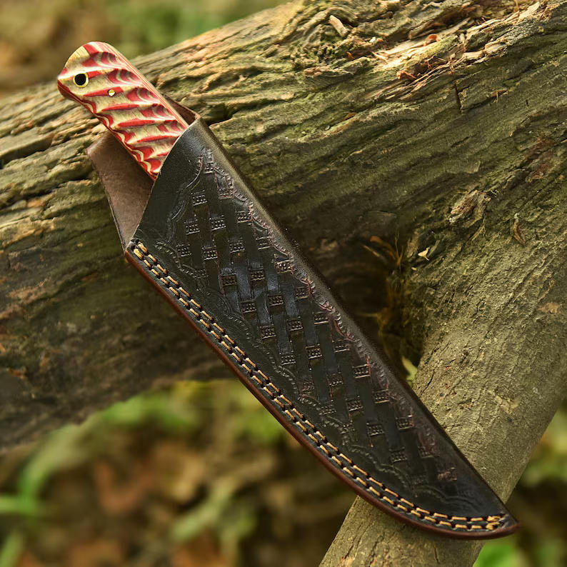 Couteau de chasse et de camping personnalisé en acier Damas inoxydable haute durabilité, fait main, avec manche en bois coloré, couteau utilitaire de terrain
