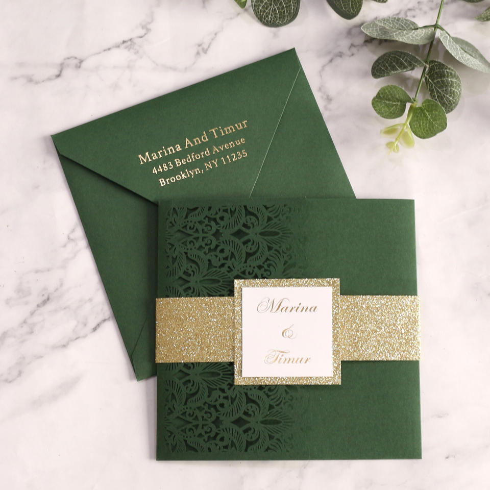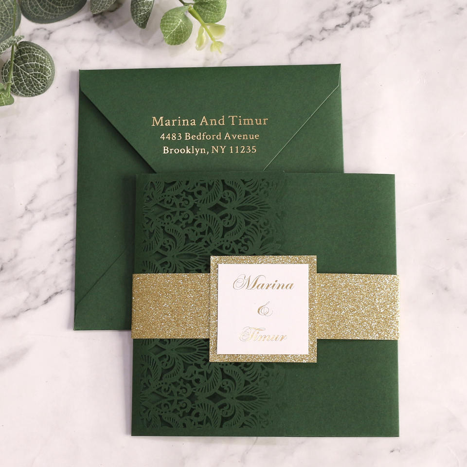 Carte d'invitation de mariage carrée au laser verte foncée personnalisée, texte estampé à chaud avec enveloppe, sceau de taille, carte à trois plis