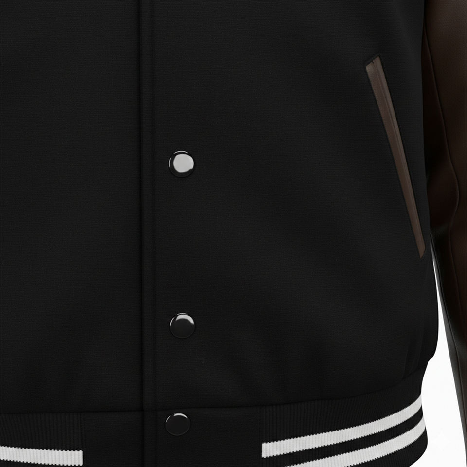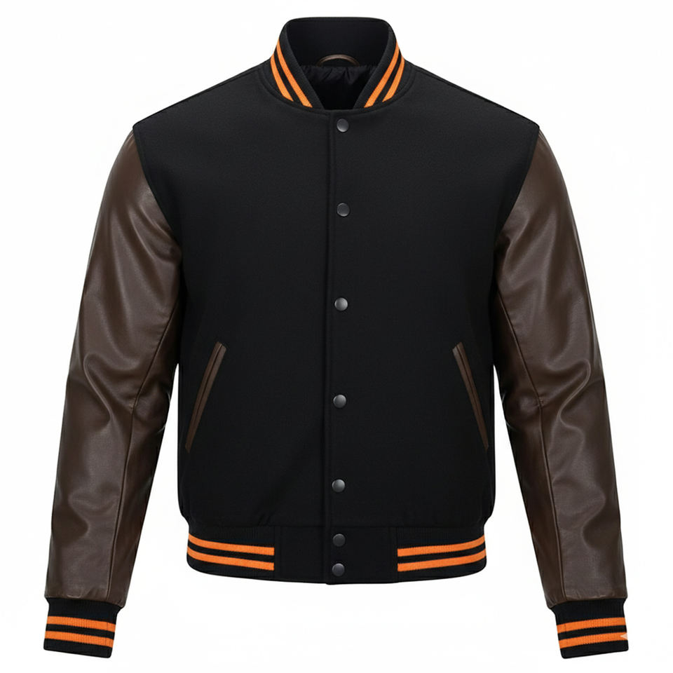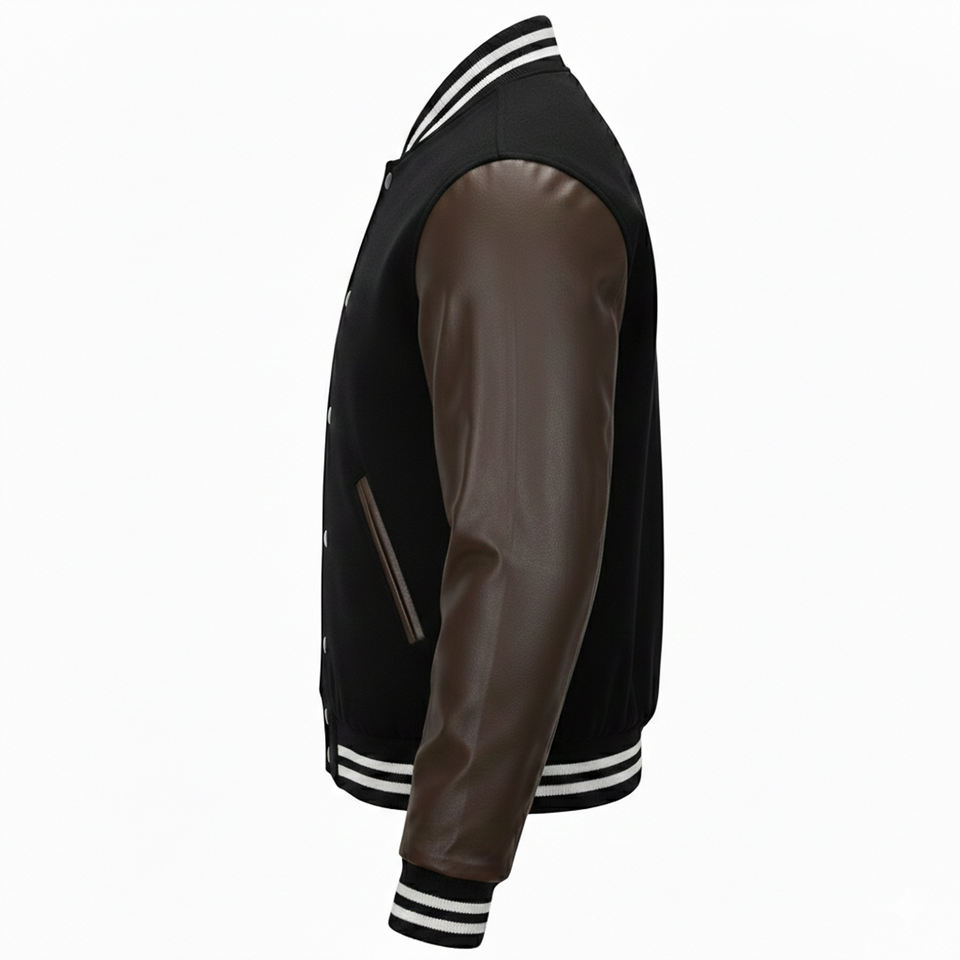 Blouson bomber écologique vert foncé personnalisé avec manches en coton marron foncé, col en V, fermeture éclair, détails brodés pour homme