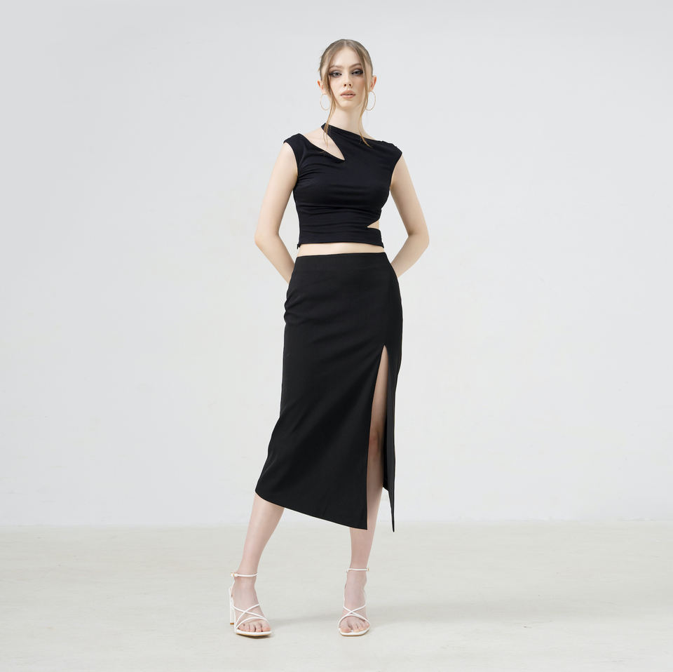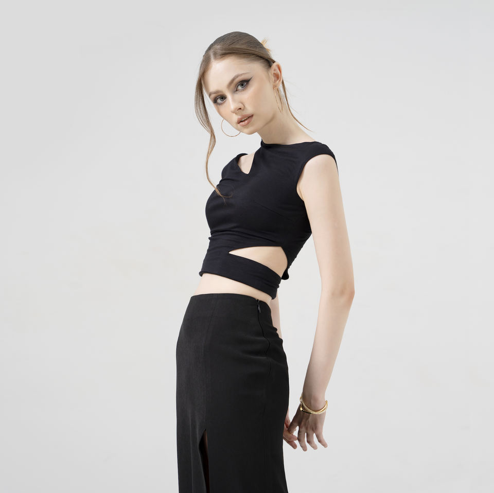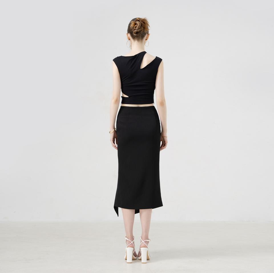Design personnalisé Noir Femmes Crop Top Femmes Asymétrique Spandex Jersey Tressé Crop Top Sans Manches Au-dessus Du Genou Longueur