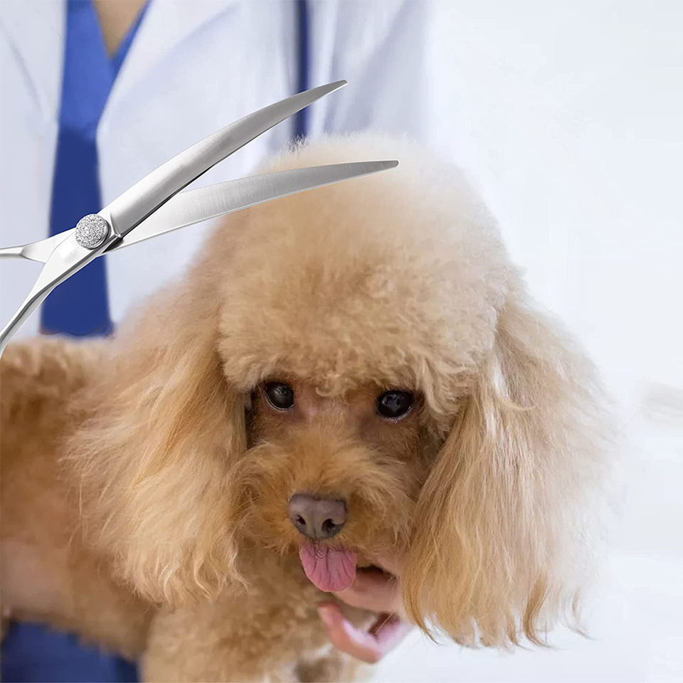 Ciseaux de toilettage au design personnalisé Finition satinée Ciseaux de toilettage à lame tranchante pour chiens incurvés avec emballage personnalisé