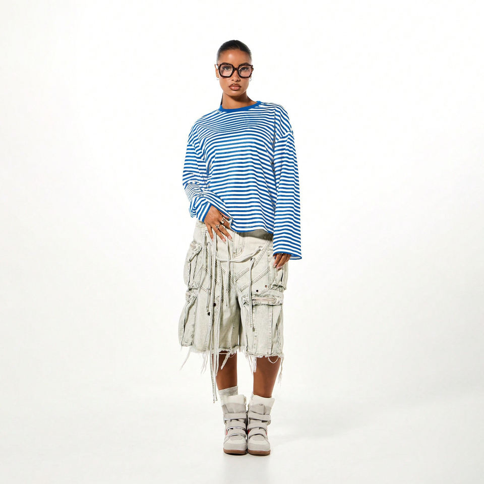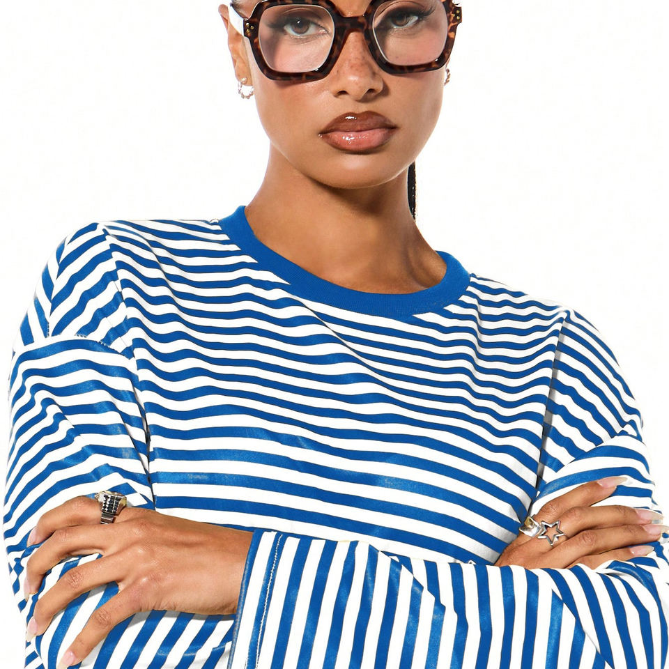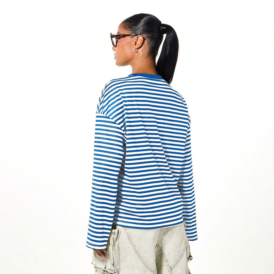 T-shirts décontractés à manches longues et col rond pour femmes, en coton, avec logo personnalisé, style hip-hop, de haute qualité, amples et rayés