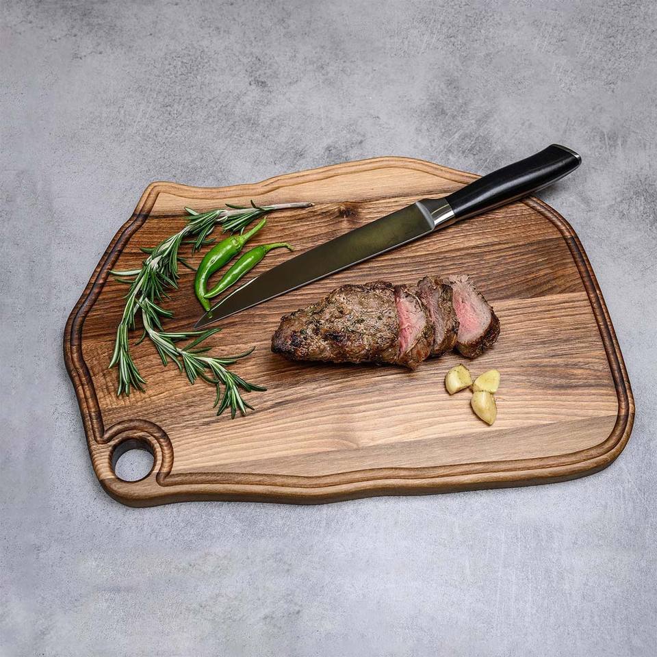 Conception personnalisée de planche à découper et de service asymétrique en bois de noyer naturel épais plateau en bois avec rainure à jus planche à charcuterie
