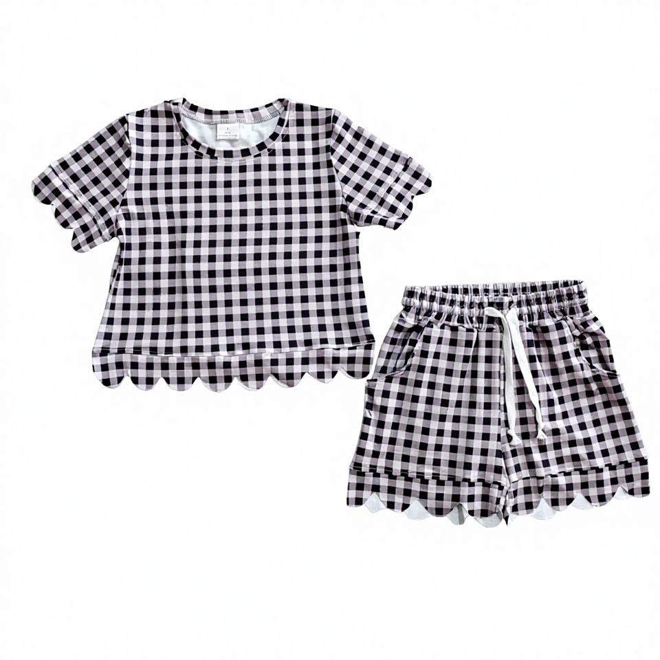 Ensemble deux pièces sans manches en polyester pour bébés filles, motif carreaux noirs, doux et estival, conception personnalisée, fabrication professionnelle OEM