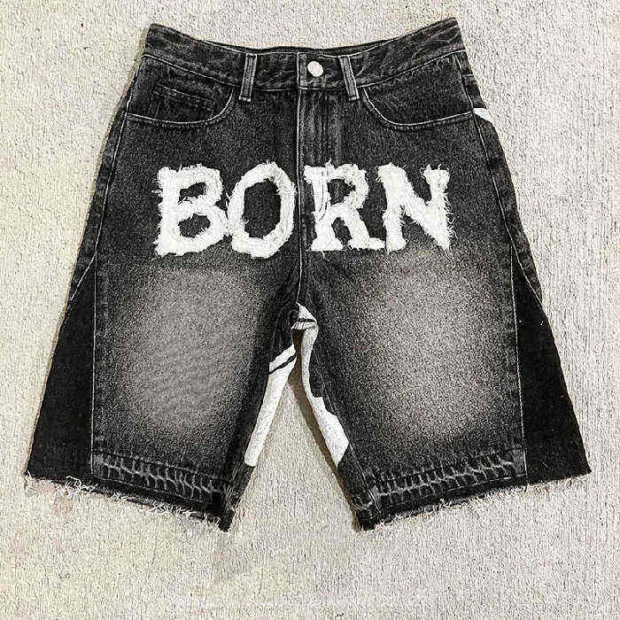 Design personnalisé respirant taille moyenne ourlet brut appliques broderie patchs Logo été Streetwear Baggy Distressed Denim Shorts