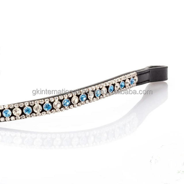Design personnalisé bleu ciel et cristaux clairs décoratifs en forme de vague en cuir noir bandeau de front de cheval en plein Cob sur les tailles